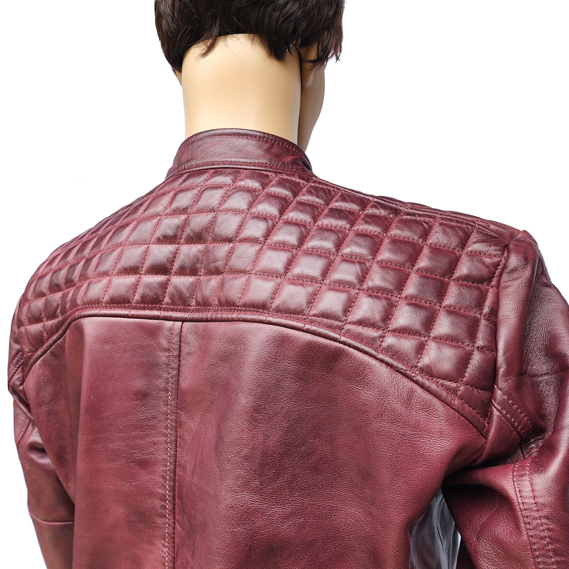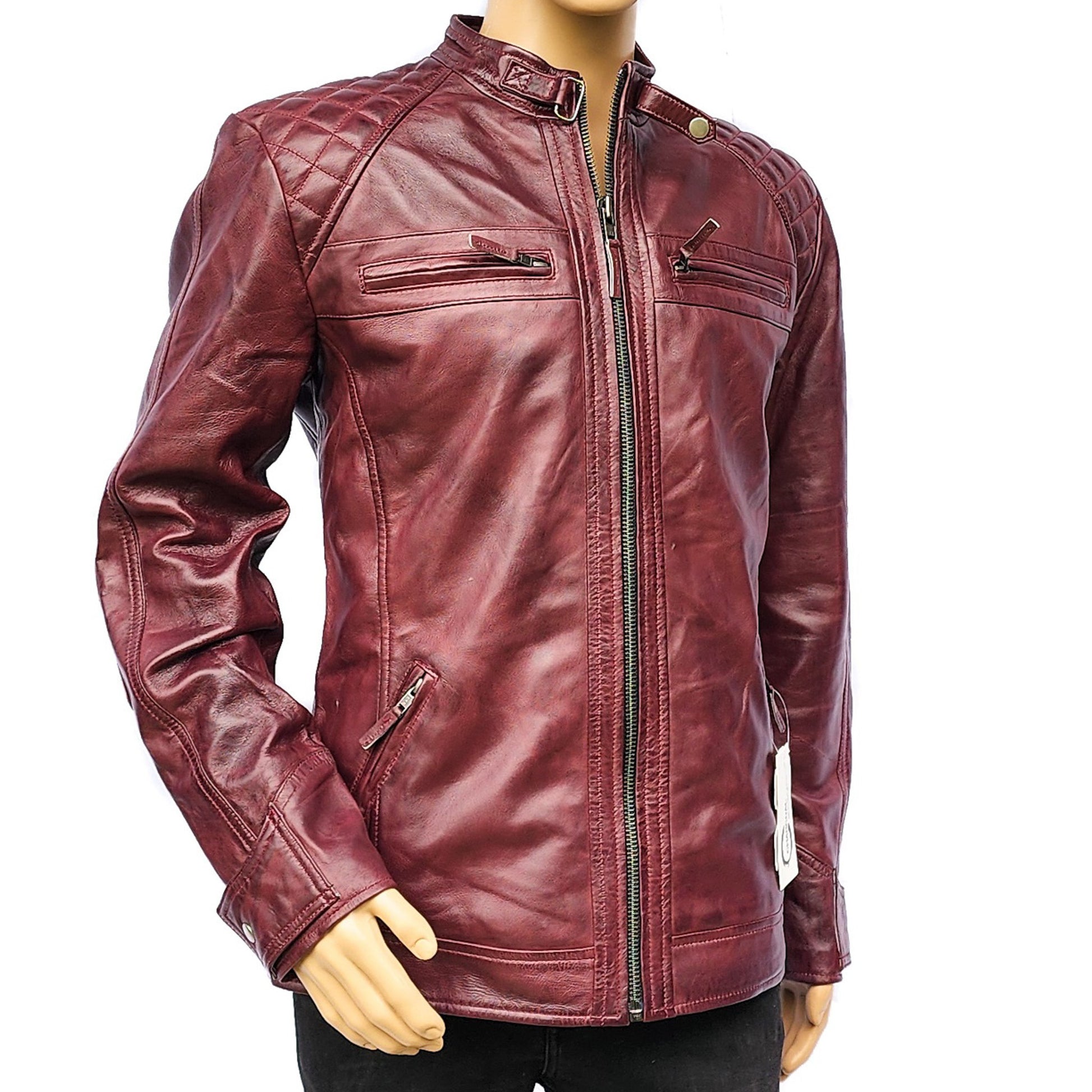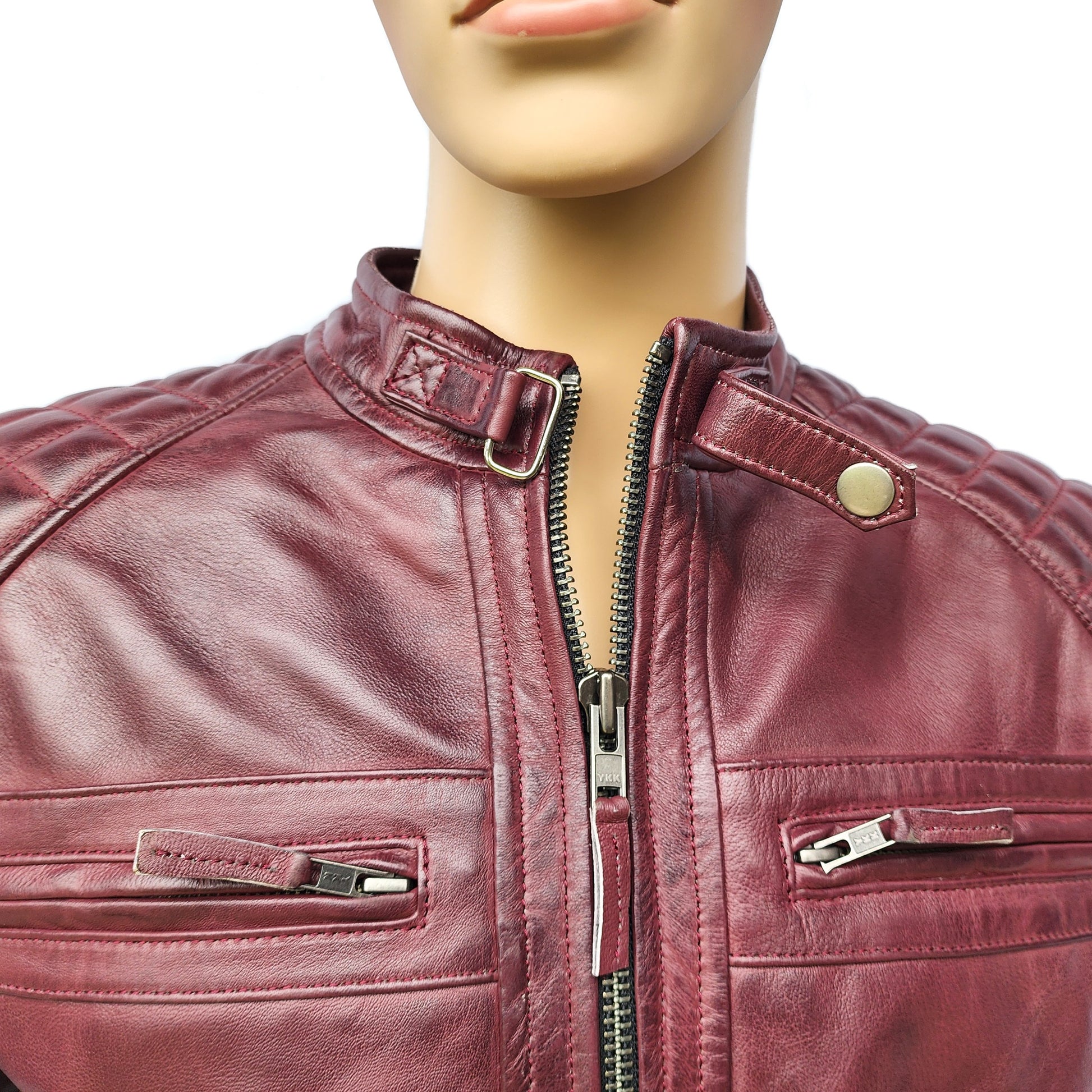 Description: Mens leather jacket made with REAL lambskin leather - burgundy with quilted shoulders.