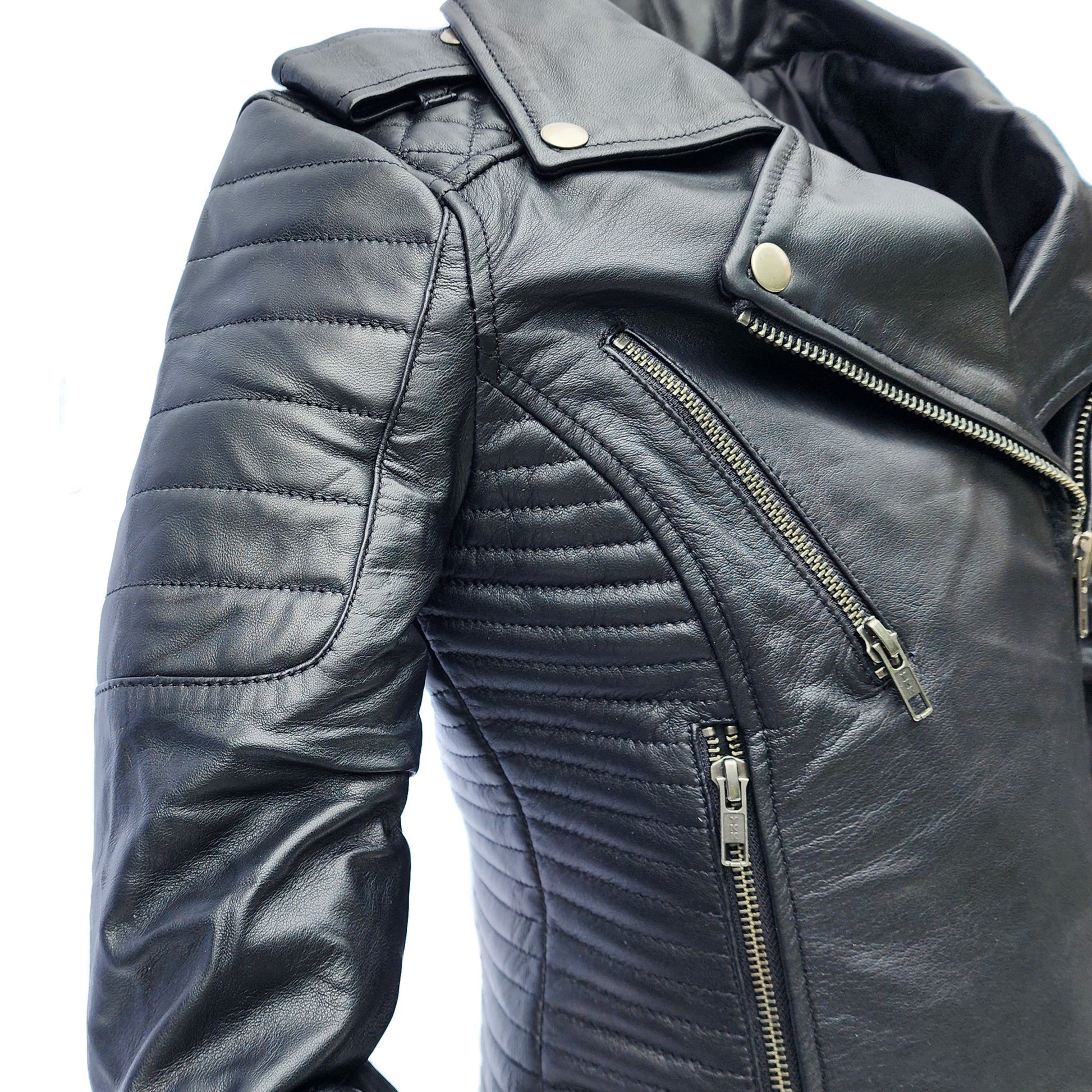 Description: Womens leather jacket made with REAL lambskin leather - Black, side zip, ribbed & quilted