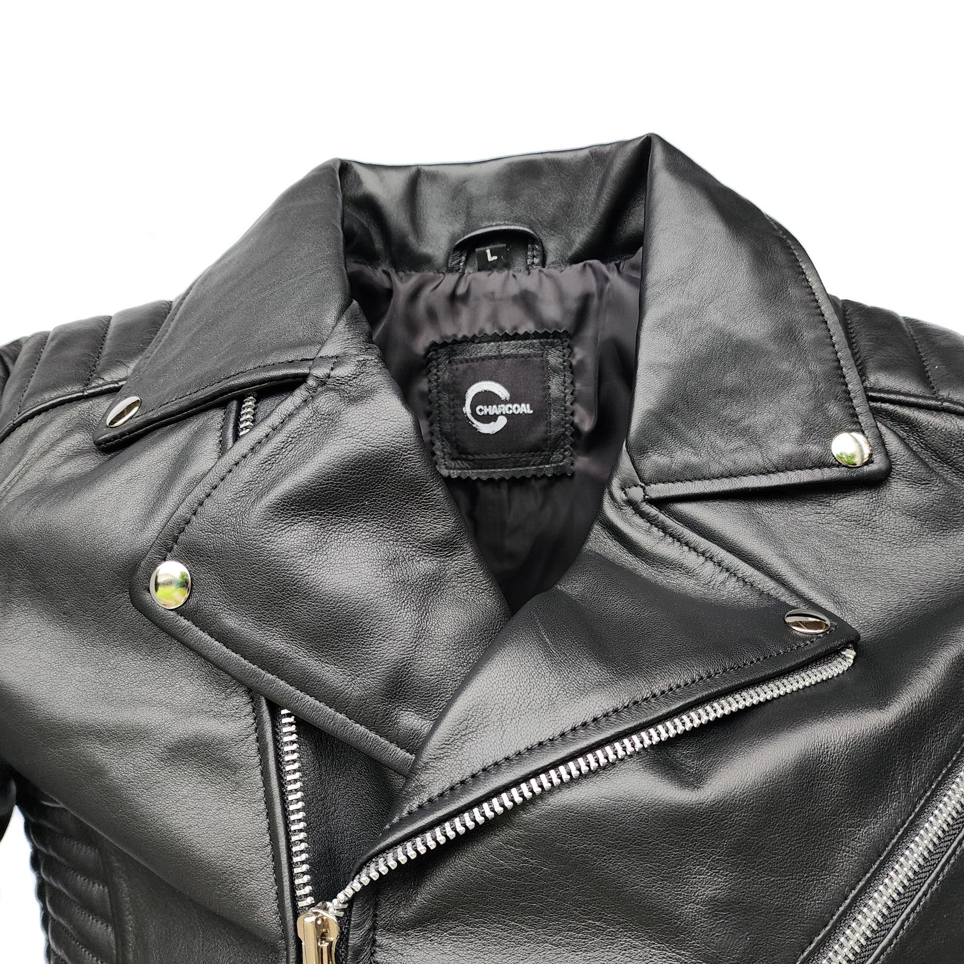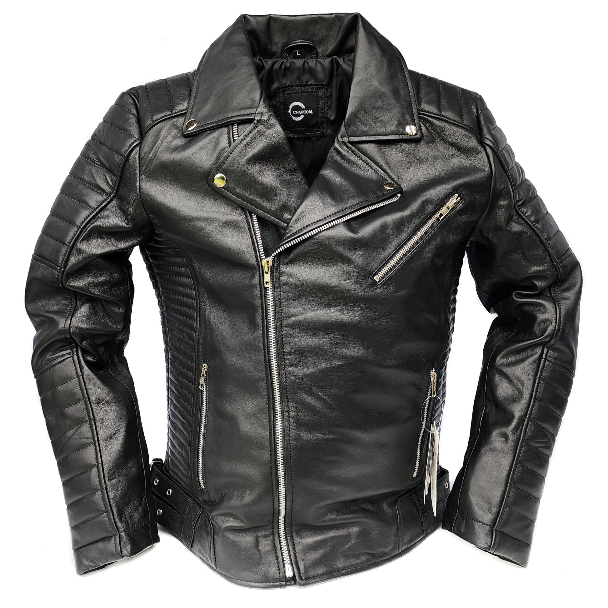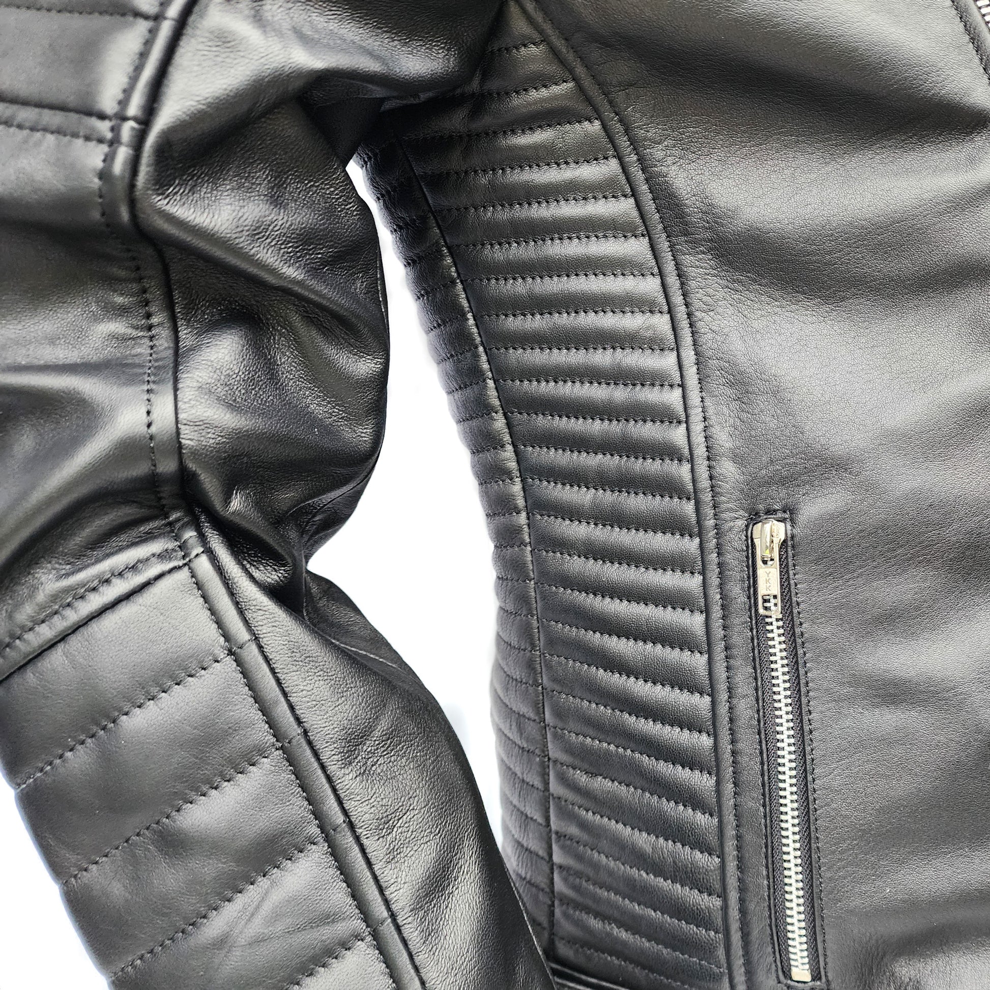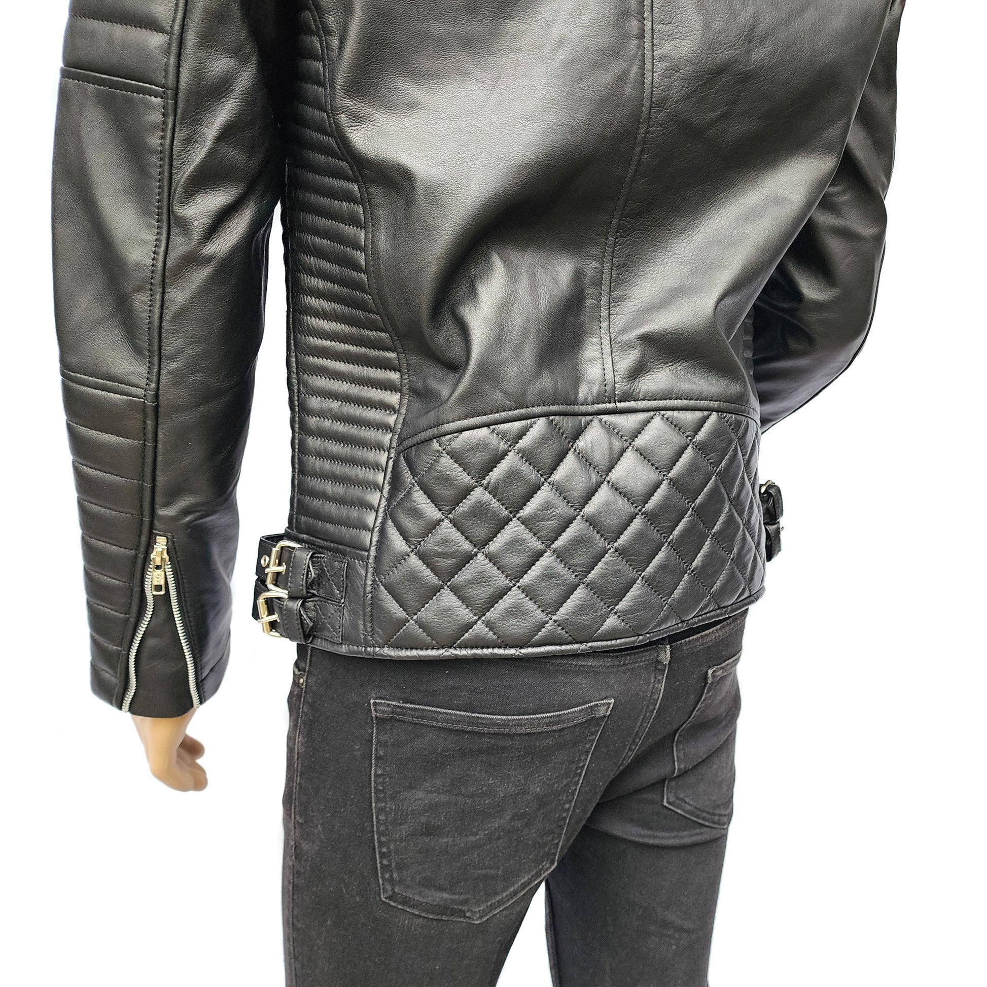 Description: Mens leather jacket made with REAL lambskin leather - black with side zip, ribbed & quilted with double collar