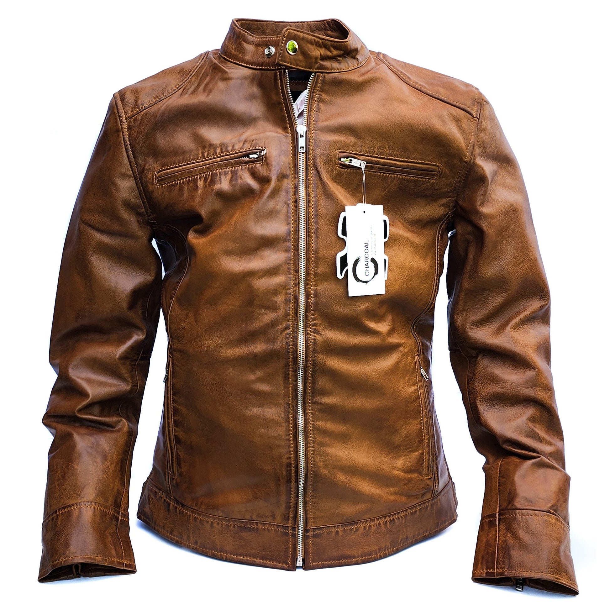 Description: Mens leather jacket made with REAL lambskin leather - Tan in a classic cut style jacket