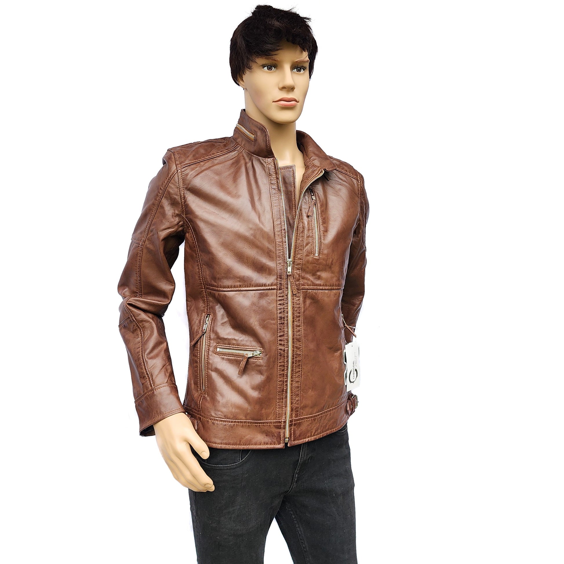 Description: Mens leather jacket made with REAL lambskin leather - classic brown