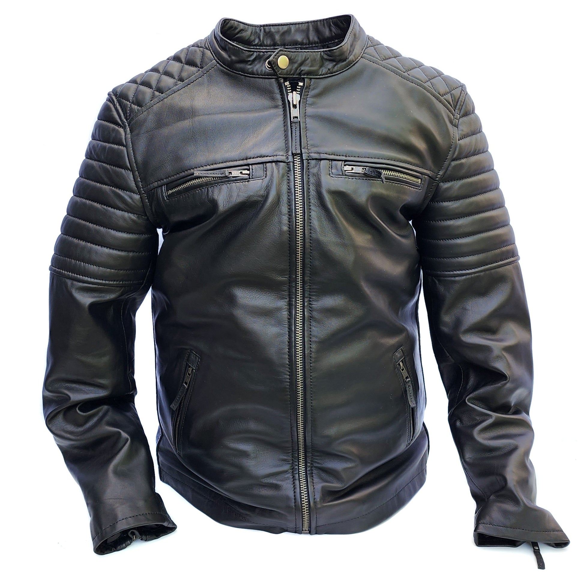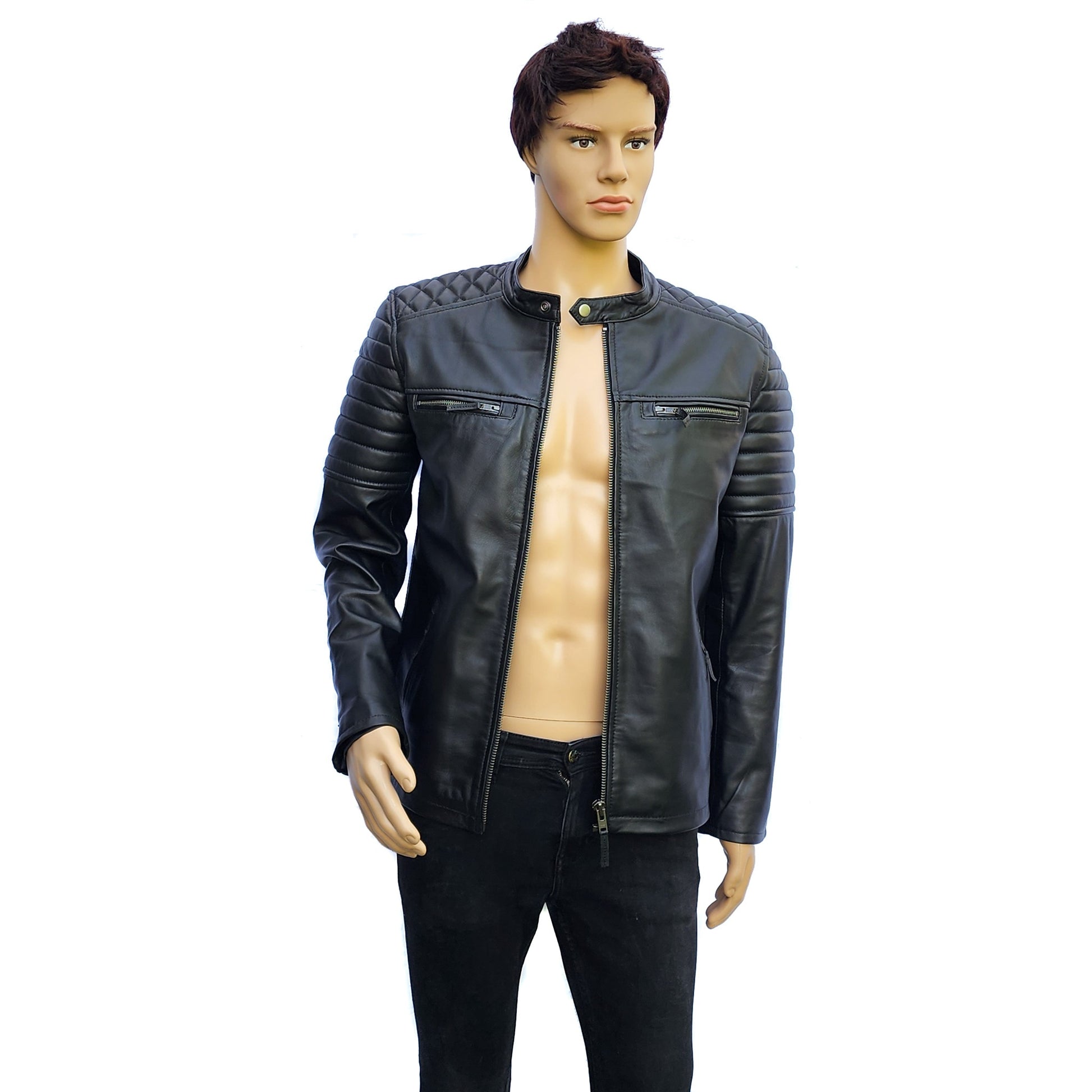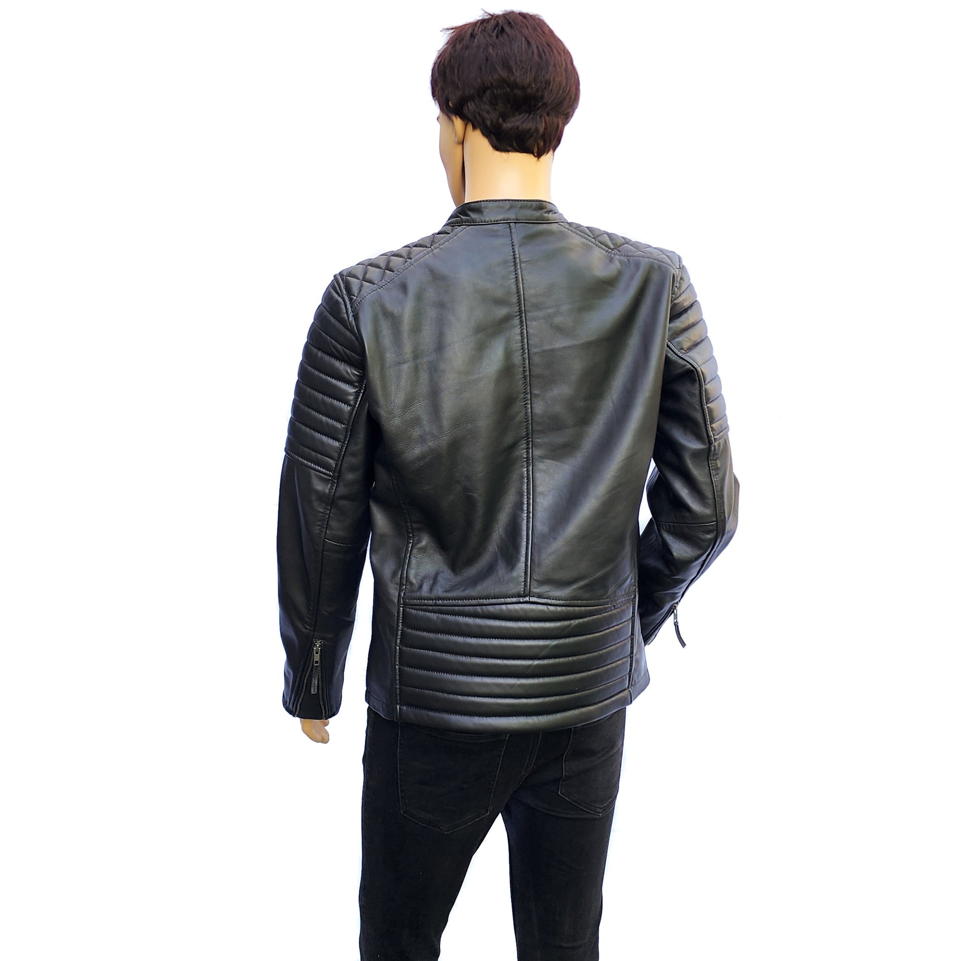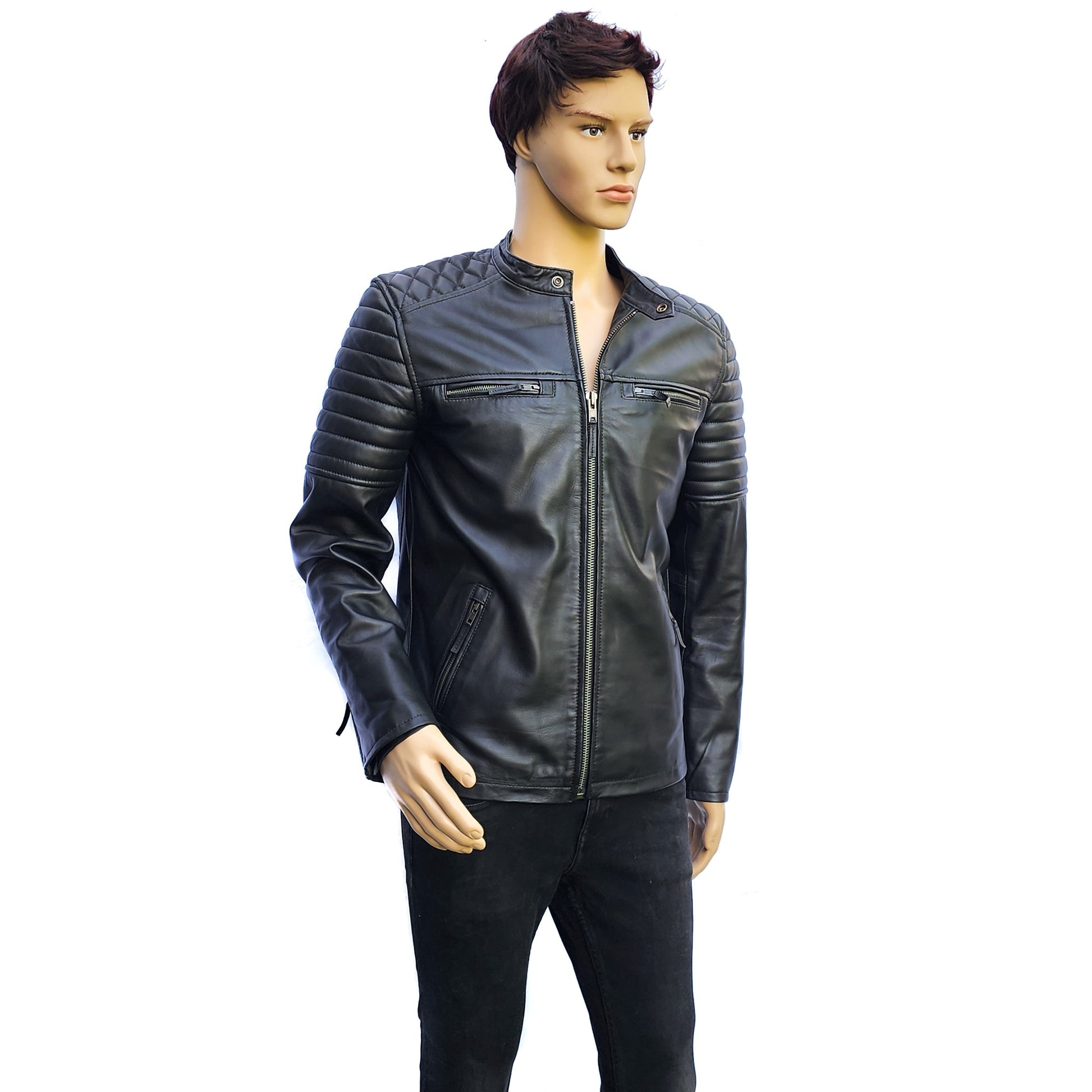 Description: Mens leather jacket made with REAL lambskin leather - black with quilted & ribbed shoulders & lower back